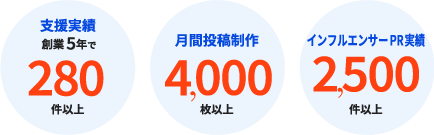 インフルエンサーPR実績2,500件以上。インフルエンサー施策も迅速・低額から対応可能。